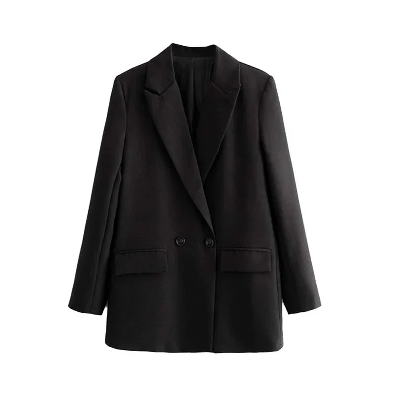 Stap in verfijning met onze Chique kantoorblazer voor dames. Deze blazer met twee rijen knopen heeft een vintage kraag met inkepingen en lange mouwen, voor een tijdloze maar eigentijdse look. Hij is met oog voor detail gemaakt en combineert klassiek kleermakerswerk met moderne elegantie, waardoor hij de perfecte aanvulling is op elke professionele garderobe.