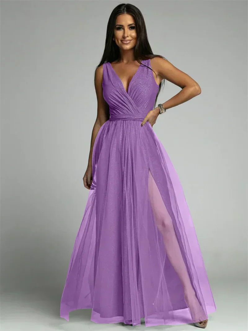 Deze jurk is ontworpen met een sexy gekruist ontwerp dat de aandacht trekt. Het mouwloze silhouet en de split in de zoom zorgen voor een verfijnde uitstraling, ideaal voor feesten en evenementen.