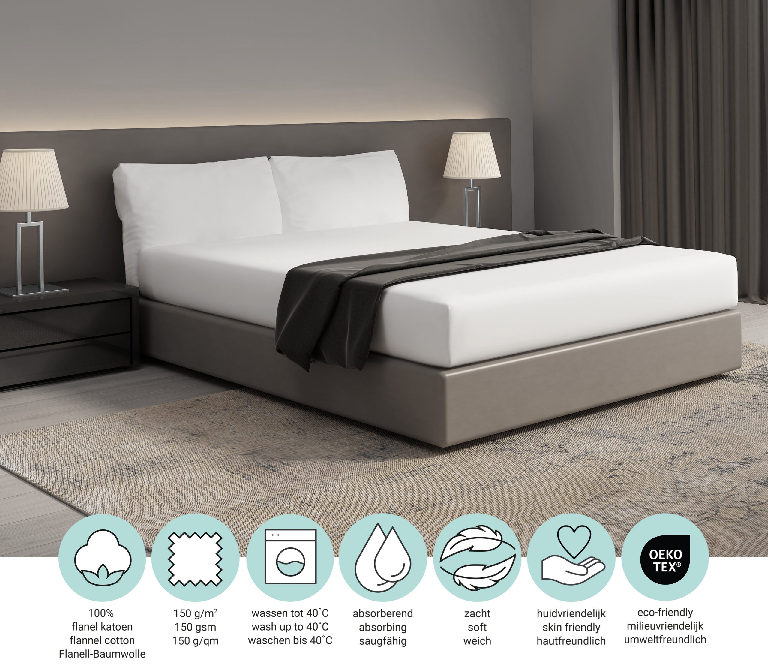 Dit flanellen hoeslaken is gemaakt van 100% zacht katoen met een draaddichtheid van 160 gram per vierkante meter. Het is voorzien van elastiek rondom, waardoor het perfect past om matrassen met een afmeting van 140×200 cm en een hoekhoogte tot 25 cm. Het hoeslaken is ademend, vochtregulerend en warmteregulerend, wat bijdraagt aan een comfortabele en ongestoorde nachtrust. Bovendien is het duurzaam en slijtvast, zodat je er lang van kunt genieten. Het hoeslaken is geschikt voor volwassenen en is gecertificeerd door STANDARD 100 by OEKO-TEX en BSCI, wat betekent dat het voldoet aan strenge eisen op het gebied van kwaliteit en duurzaamheid.