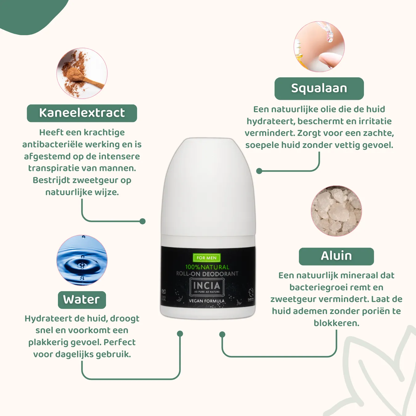Het belangrijkste ingrediënt van natuurlijke deodoranten van INCIA is aluin. Een bekende misvatting is dat aluin een schadelijk aluminium is. De aluin die in INCIA Natuurlijke Deodorant voor Mannen wordt gebruikt is echter van natuurlijke oorsprong. Dit aluin is een mineraalzout en kristal met een natuurlijke antibacteriële werking. Hierdoor krijgen bacteriën geen kans om zich te vermenigvuldigen en zweetgeur te veroorzaken.