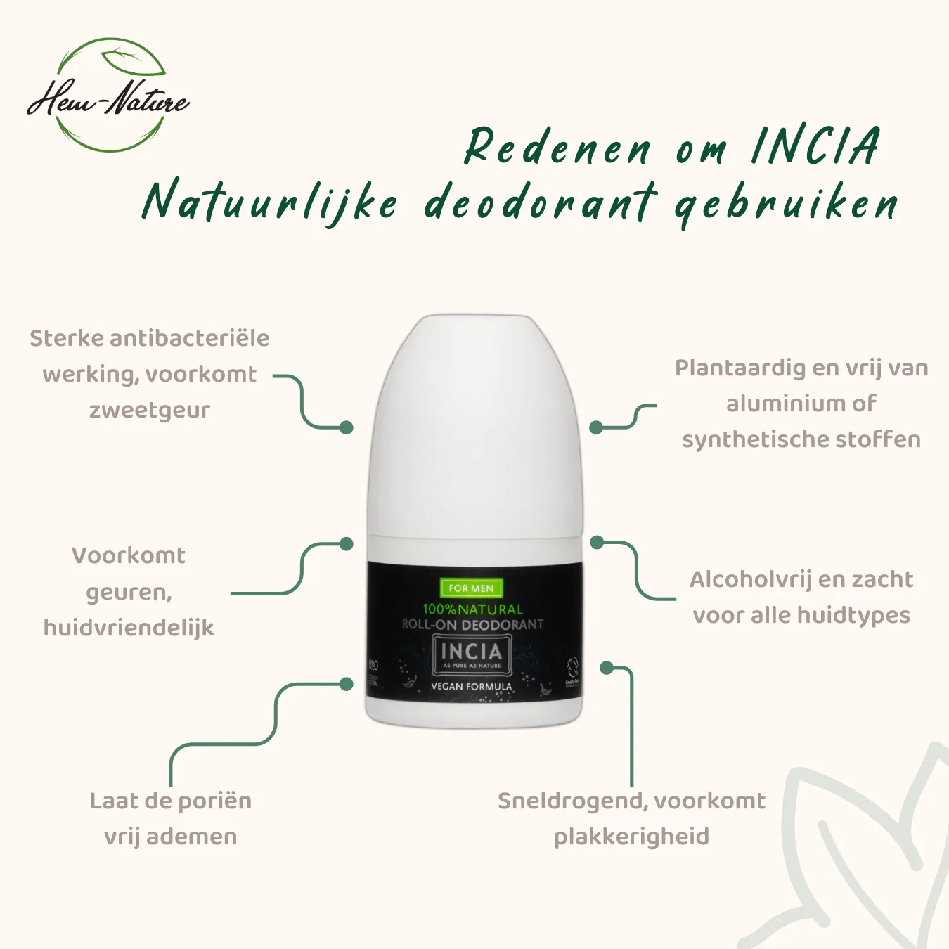 Mannen zweten wetenschappelijk bewezen meer dan vrouwen. Een natuurlijke deodorant die de vermenigvuldiging van bacteriën onder de oksel voorkomt, is dan noodzakelijk. Het zijn namelijk de bacteriën die voor zweetgeur zorgen. INCIA Natuurlijke Deodorant voor Mannen heeft een sterke antibacteriële werking en helpt de huid bacterievrij en droog te houden. De deodorant ruikt prettig en is gemakkelijk op te brengen.