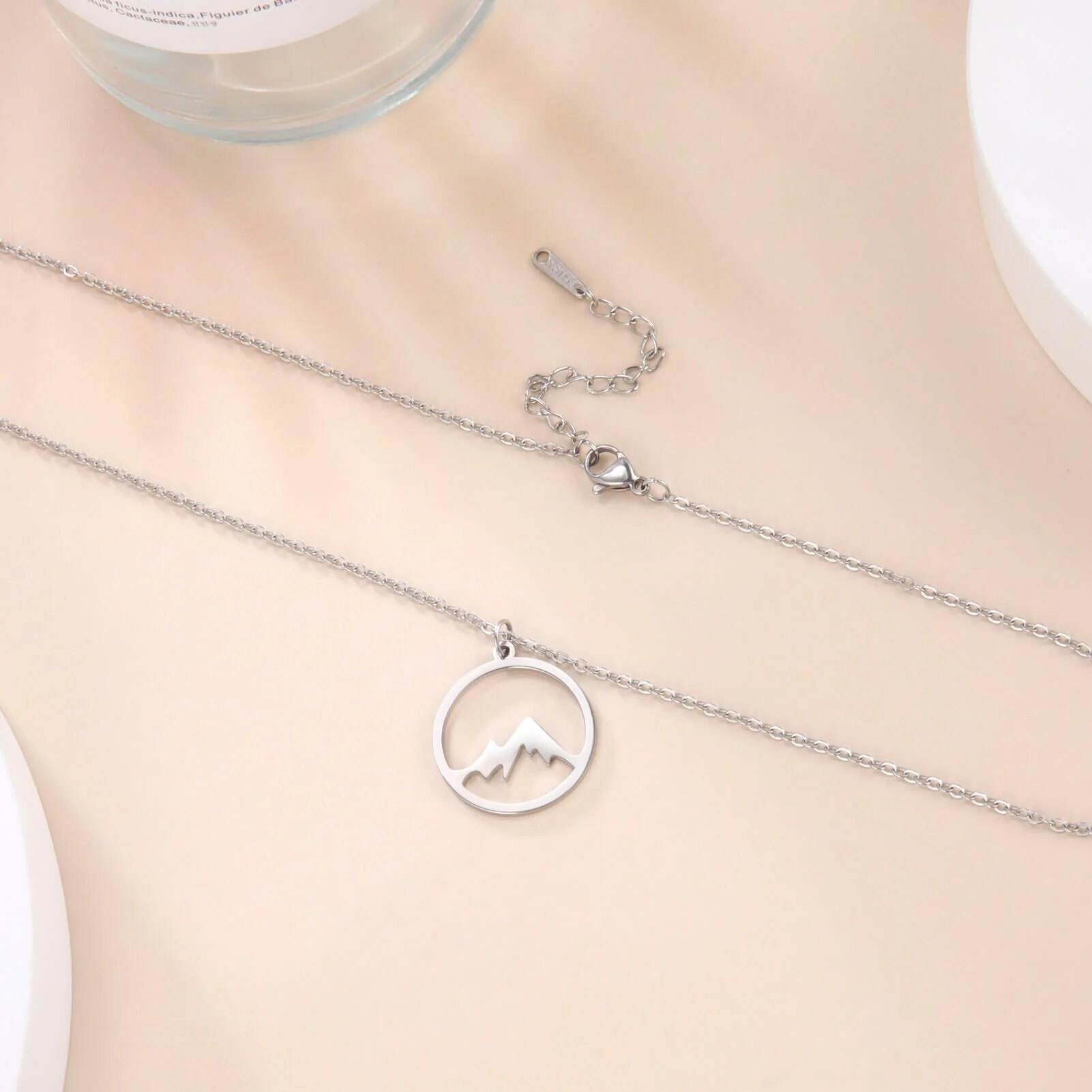 Deze simplistische ketting met een munthanger met uitzicht op een bergketen kan precies zijn wat u nodig hebt. De hanger toont een vereenvoudigd silhouet van twee besneeuwde bergtoppen. De ketting, inclusief de hanger en de ketting, is gemaakt van massief roestvrij staal.