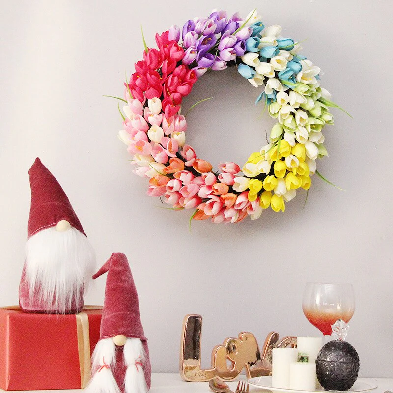 De lente roept en deze prachtige tulpenkrans met kleurrijke tulpen zal de hele lente en zomer op uw deur een statement maken. Er wordt gezegd dat de lentekrans staat voor nieuw leven, terwijl de ronde vorm en het groenblijvende materiaal de krans tot een voorstelling van het eeuwige leven maken.
