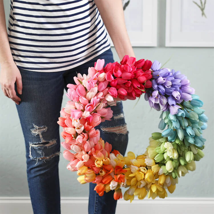 Fleur uw deur op met deze weelderige regenboog tulpenkrans. Het creëren van een mooie tulpenkrans vereist een goed kleurenschema en de perfecte hoeveelheid tulpen om een volle, overlappende look te creëren. Tulpenkransen hebben mooie subtiele lagen om volheid en vloei te creëren. Ze zijn altijd populair en passen perfect bij de lente!